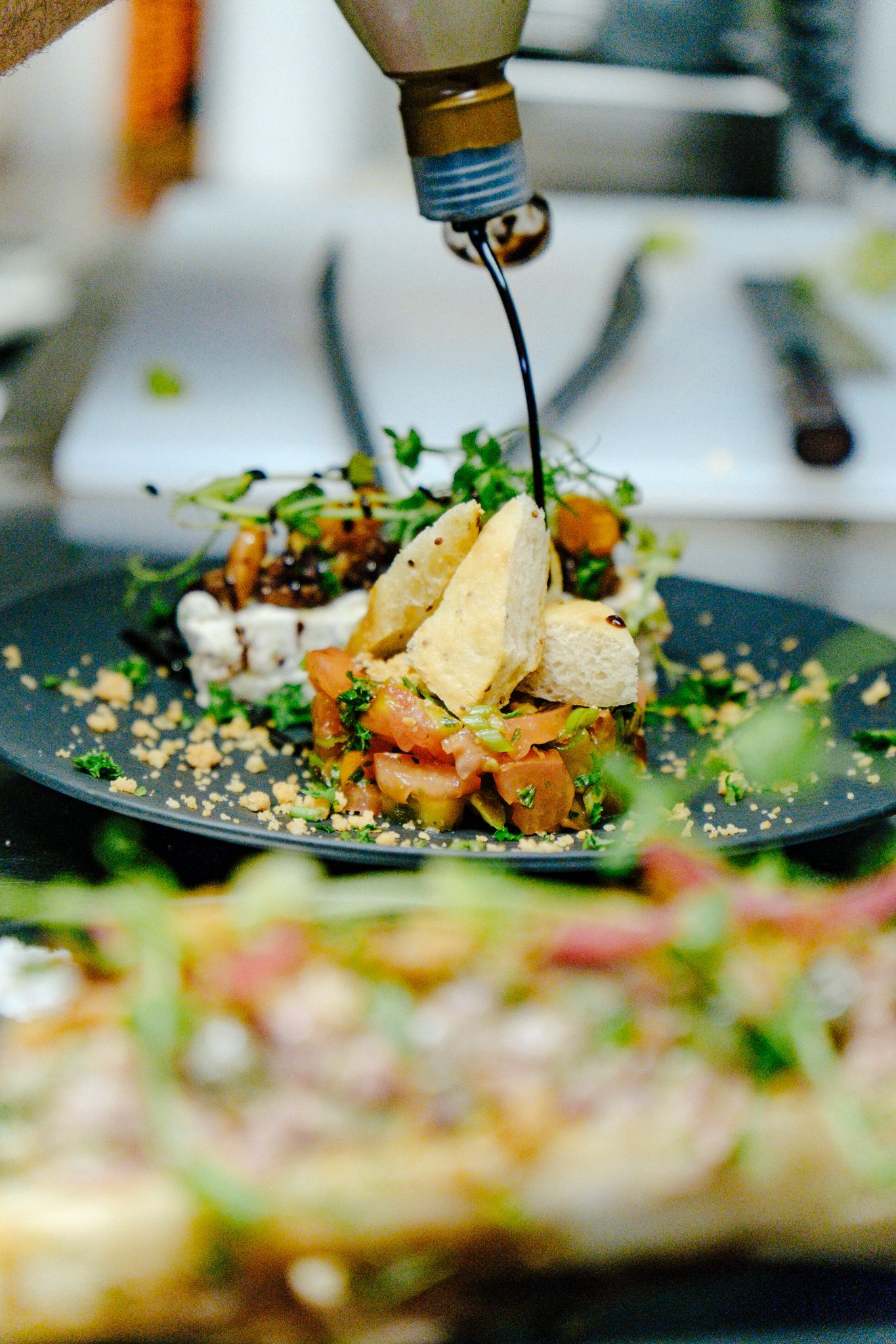 HOUMOUS D’ÉPINARD, PIPERADE DE LÉGUMES DU SOLEIL, ÉMULSION DE CHORIZO